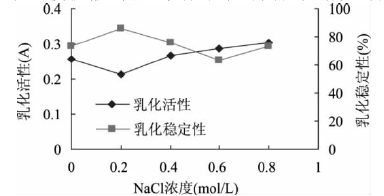 [9]等人在研究鷹嘴豆分離蛋白乳化性質時,選用不同梯度的離子濃度,分別為0.1、0.2、0.4、0.6、0.8mol/L的NaCl溶液,測定乳化活性和乳化穩定性。結果如下: